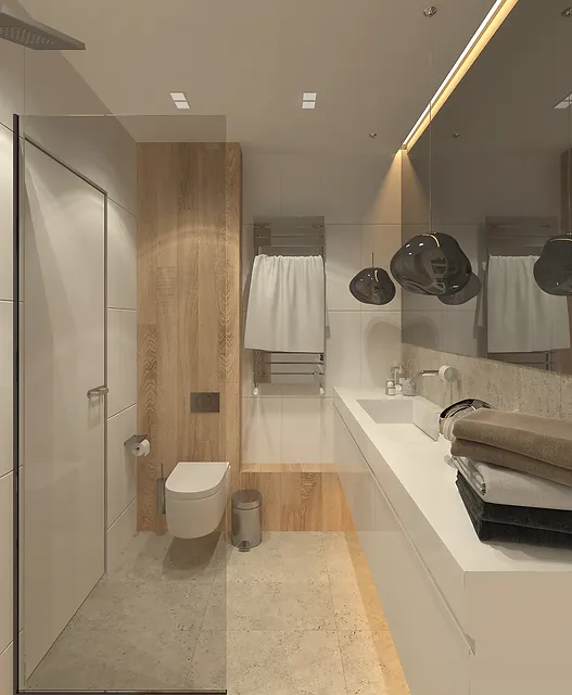 Санузел хозяев выполнен в стиле минимализм. Плитка в серо-бежевых тонах. Санузел украшает зеркало во всю стену, которое визуально расширяет пространство, а также футуристические подвесы. Гостевой санузел оформлен в синевато-зеленых тонах с плиткой под дерево.