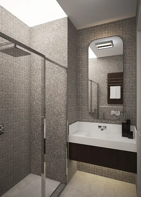 Гостевой санузел имеет форму вытянутого прямоугольника. Прозрачные створки стирают границу между душем и остальной частью помещения. Санузел отделан коричневой плиткой. По инженерному решению душевой канал сделан прямо в полу.