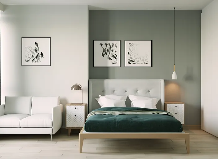 Зона кровати украшена лаконичным подсветом и минималистическими картинами. Есть зона отдыха с маленьким диванчиком. Стены выполнены в жемчужных и графитовых тонах. А кровать обшита темно-зеленой оббивкой.