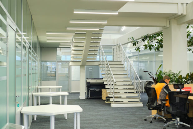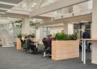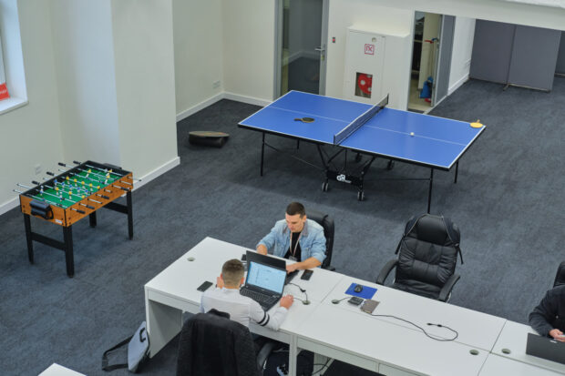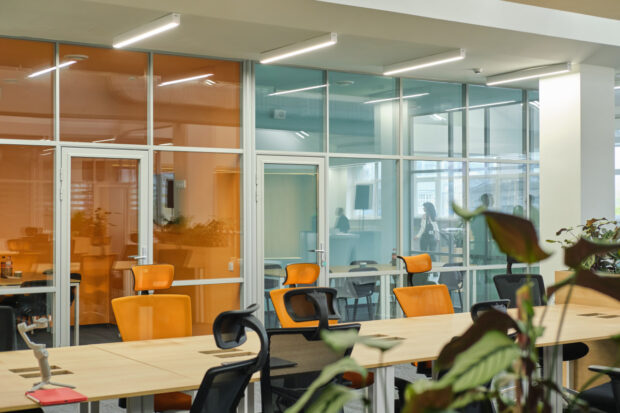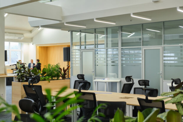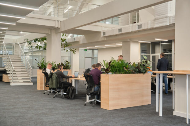 Простір має загальні робочі зони, розподілені за рівнем гучності, від тихої до гучної, де знаходяться “Hot Desks” – що дає можливість змінювати робочу обстановку, в залежності від потреб, в будь-який час. Є окремі офіси для команд.