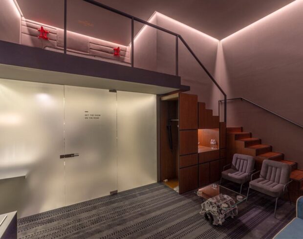 Каждый номер удачно сочетает в себе все необходимое для комфортного, полноценного отдыха и элементы дорожного путешествия – автомобильные покрышки, кресла, лампы, на бетонном полу следы от шин.