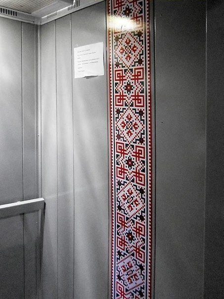 Украинский орнамент появился на стенах кабины всего за одну ночь. Жильцы говорят, что такими наклейками украсила лифт председатель их дома, вместе с мужем и сыном. А с утра уже все соседи смогли оценить обновленный лифт, в котором и ездить стало намного приятнее.
