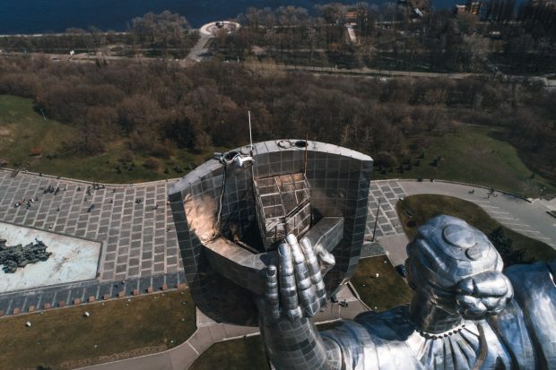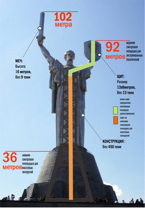 Этот лифт – находка для любителей экстрима. Он работает прямо в монументе «Родина-Мать» и поднимает на высоту 30-этажного дома. Везет лифт любителей адреналина на смотровую площадку, которая находится прямо на щите.