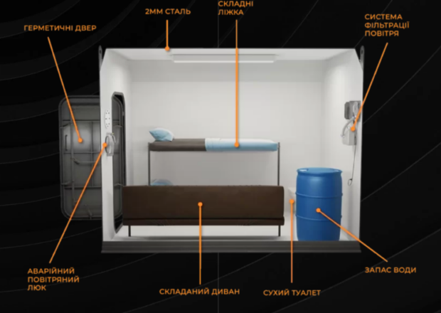 Також приваблюють покупців терміном експлуатації подібних укриттів, який сягає 100 років. До слова, послуга бомбосховища під ключ включає навіть забезпечення їжею, зокрема пропонують набір сублімованих овочів, м’яса чи повноцінний раціон їжі із запасом на 30 днів. У самому ж укритті пропонують безперебійну систему вентиляції; герметичність та вогнетривкість, автономну роботу водопостачання та газонепроникні двері.