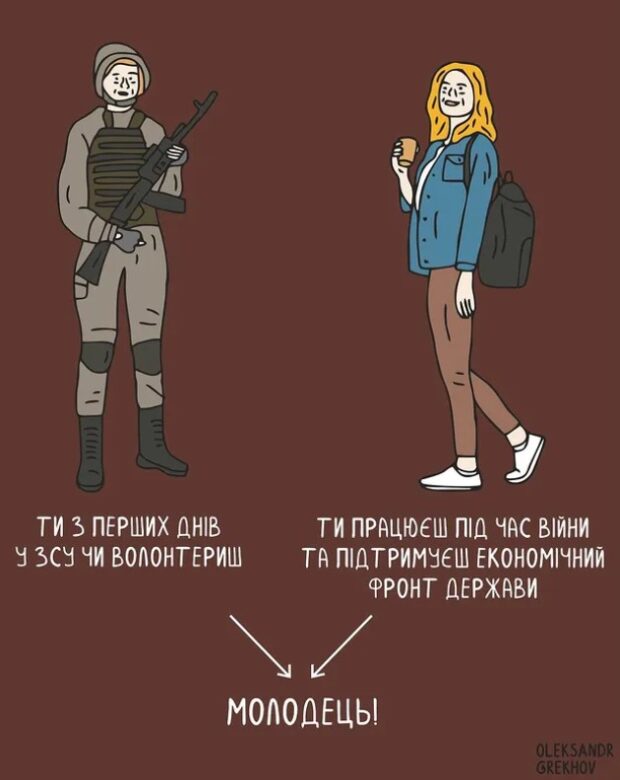 Люди роблять все, що в їхніх силах. Пам’ятайте, що зараз кожен з нас має одного спільного ворога – це росія з її кривавим тоталітарним режимом. Всі ми молодці: всі, хто допомагає армії, хто висвітлює чесні новини, хто виходить на мітинги, хто шукає роботу, хто працює і заробляє. Всі молодці, бо всі ми, українці, робимо все, щоб перемогти зло швидше. Пам’ятайте – нам всім ще треба відбудовувати країну, кожне місто і кожен будинок.