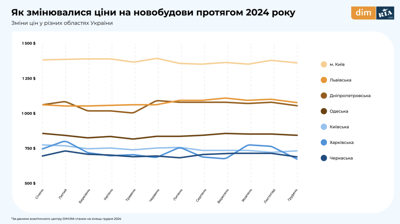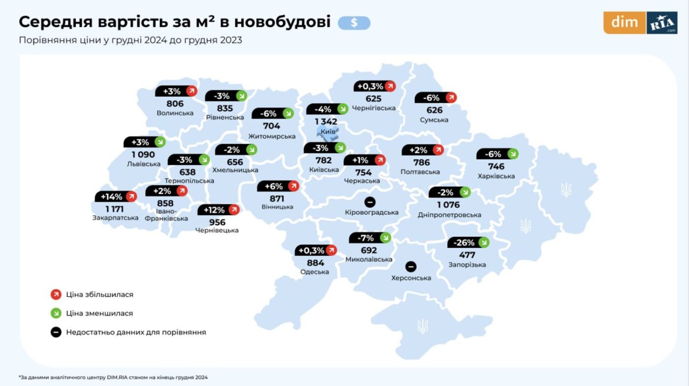 Середня вартість за один квадратний метр у доларі є найдорожчою у місті Київ – $1342, проте за рік вона знизилася на 4%, станом на кінець року. Другу сходинку за вартістю нового житла посідає Закарпатська область з $1171 за м2 (+14% за рік). Третю – Львівська, $1090 (+3% протягом року).