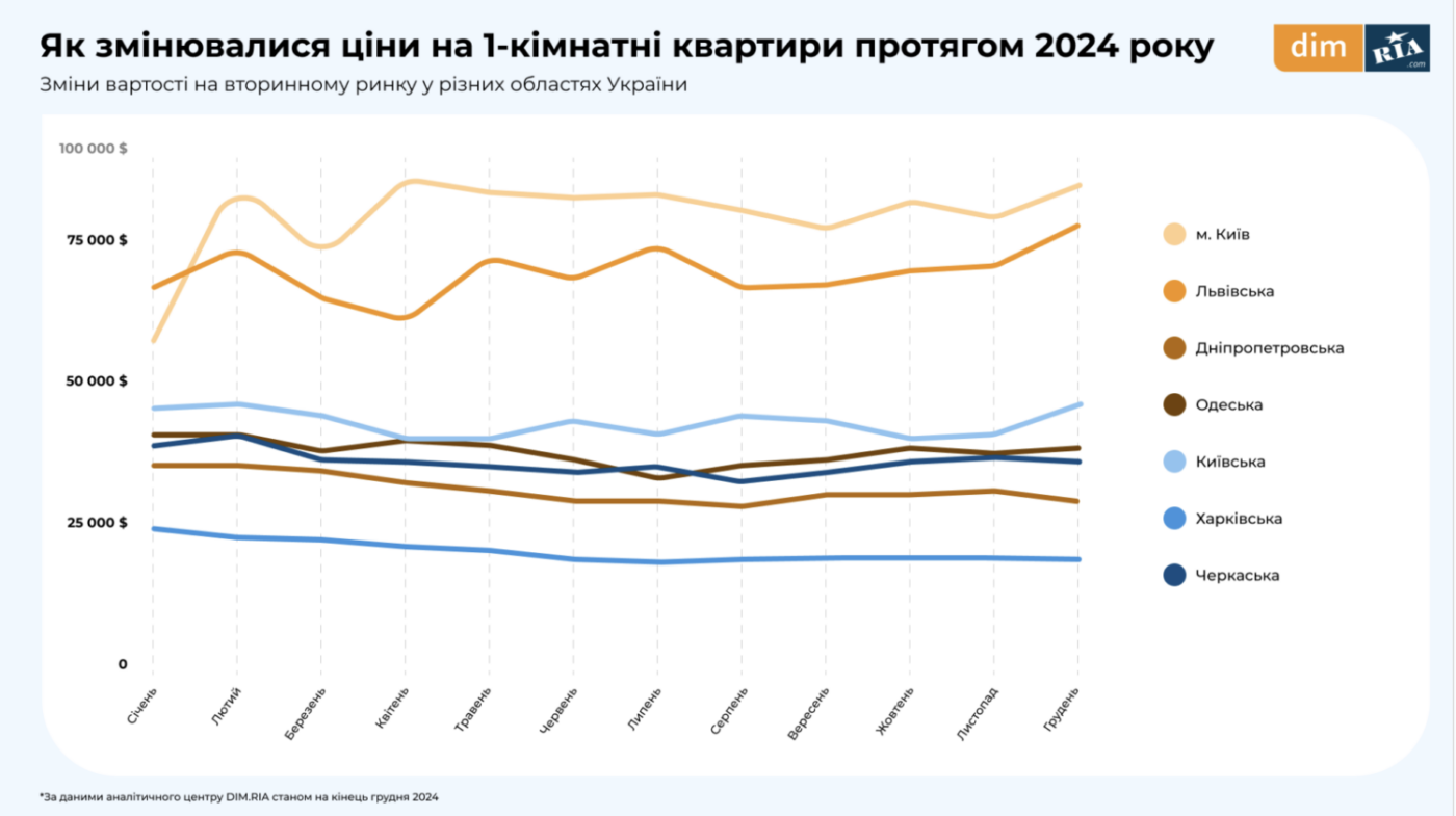 Протягом 2024 року одно-, дво- та трикімнатні квартири від власників дорожчали у переважній більшості областей. Найдорожчою локацією для купівлі вторинного житла залишається Київ: у середньому $79 тис. за однокімнатну квартиру, $115 тис. за двокімнатну та $155 тис. за трикімнатну. Другою за вартістю є Львівська область, а третю сходинку ділять Закарпатська та Волинська області.