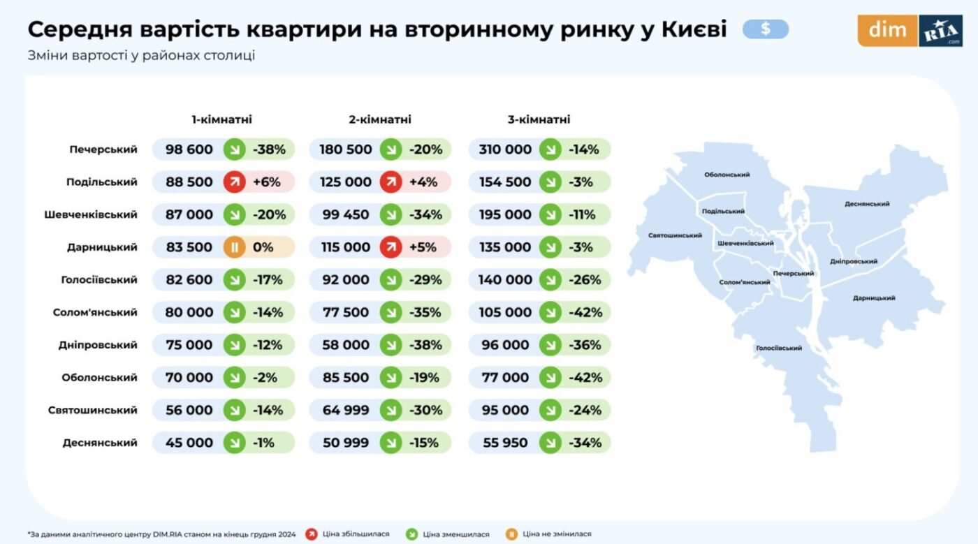 Серед районів Києва найвищу ціну за квадратний метр в новобудові має Печерський район, у середньому $2695 (-0,7% за рік). У Деснянському районі столиці можна придбати найдешевше житло, у середньому $909 за квадрат (-4% за рік).