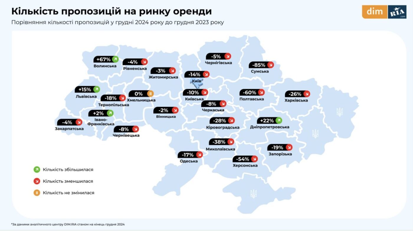 Кількість пропозицій на українському ринку оренди протягом 2024 року переважно знижувалася. Ріст відбувся у Дніпропетровській, Львівській, Івано-Франківській та Волинській областях. У решті західних областей відбулися коливання у межах до 10% порівняно з груднем 2023 року. У столиці та Київській області кількість пропозицій зменшилася на 14% та 10% відповідно.