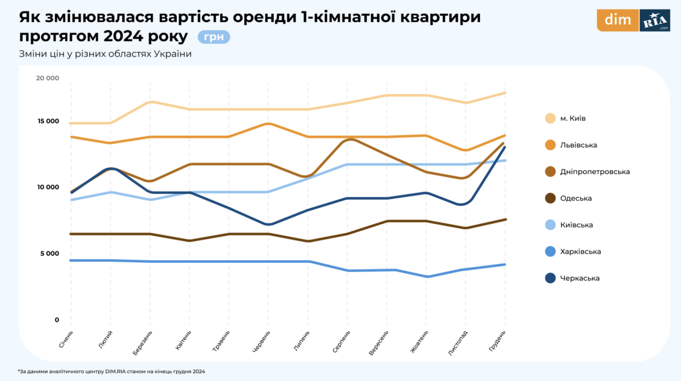 Вартість на оренду житла в Україні протягом року суттєво коливалася. За підсумками року, у більшості областей ціна зросла, найбільше – у Чернівецькій, Івано-Франківській, Київській областях (30-36% у розрізі однокімнатних квартир).