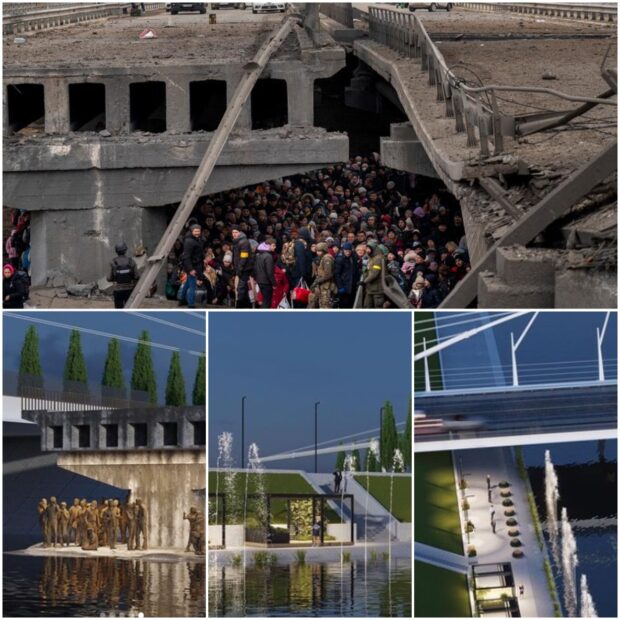 Вже згодом глава держави анонсував будівництво меморіального комплексу, присвяченого зруйнованому мосту між Ірпенем та Києвом і постраждалим від рук росіян жителям Київщини. Ймовірний взірець меморіального комплексу запропонував український архітектор Іван Огієнко. Концепцію архітектурного об’єкту можна побачити на фото, одна з головних деталей – постать людей та рятувальників.