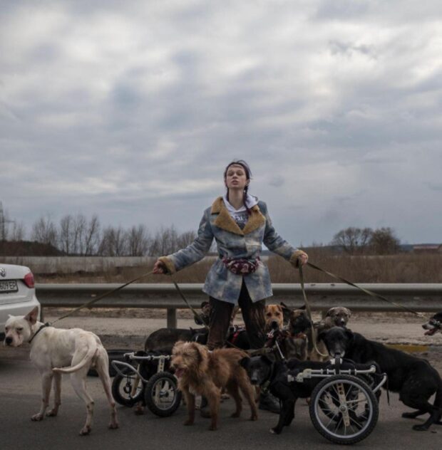 Фотограф Christopher Occhicone зробив знімок з 20-річною Настею. Дівчина з собаками стоїть з гордо піднятою головою. Деякі з них на колясці, проте українка навіть не допускала думки залишити їх в Ірпені. Наразі вона з тваринами вже в безпеці, а її знімок став популярним у всіх іноземних газетах.