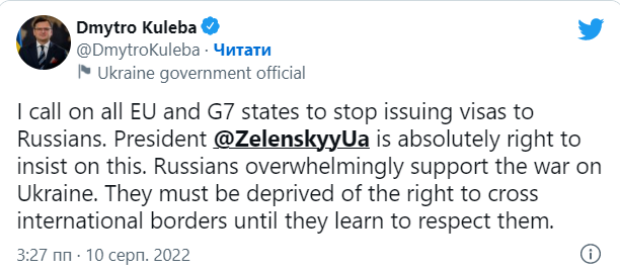 “Я закликаю всі країни ЄС і G7 припинити видавати візи росіянам. Президент Зеленський абсолютно правильно наполягає на цьому. Росіяни переважно підтримують війну проти України. Вони повинні бути позбавлені права перетинати міжнародні кордони, поки не навчаться їх поважати” – написав Кулеба у Twitter.