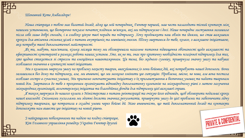 Котячий дипломат як ніхто інший розуміє, що тварини так само як і люди, страждають від обстрілів, тривог, втрати домівок, але попри все вони залишаються вірними своїм господарям, допомагають їм та навіть рятують їх життя. Зокрема, в одному з написаних ним листів, Амбасадор звертається по допомогу до свого британського колеги – мишолова резиденції британських прем’єрів кота Ларі.