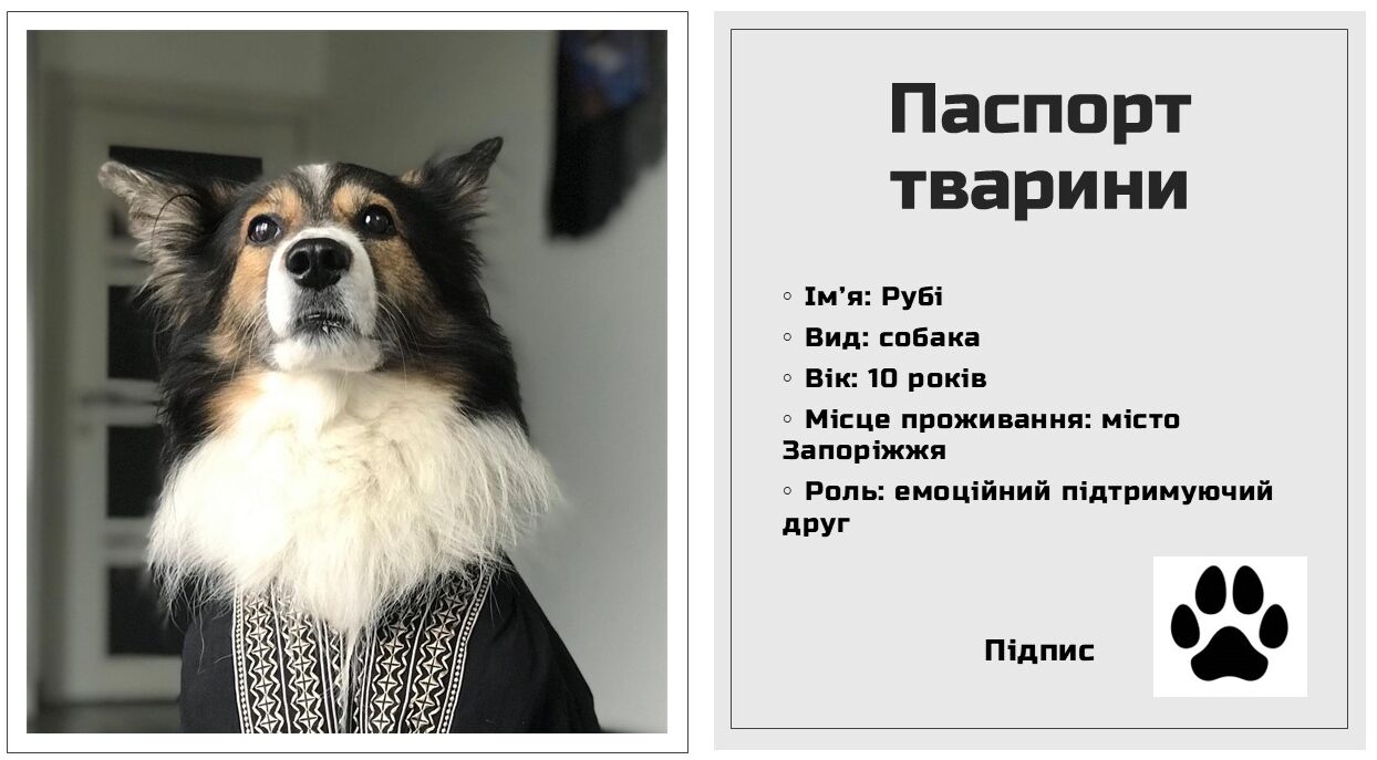 Паспорт ТариСлужбова собака Тара за своє ще поки недовге життя пройшла чималу кількість складних моментів. Від початку війни, вона разом з господарем, вступила до складу ТРО, а пізніше до патрульної служби, де  виконувала спектр різноманітних завдань: від патрулювання вулиць міста під час комендантської години до участі в емоційній для себе рятувальній операції, коли ворожий безпілотник влучив у багатоповерхівку.