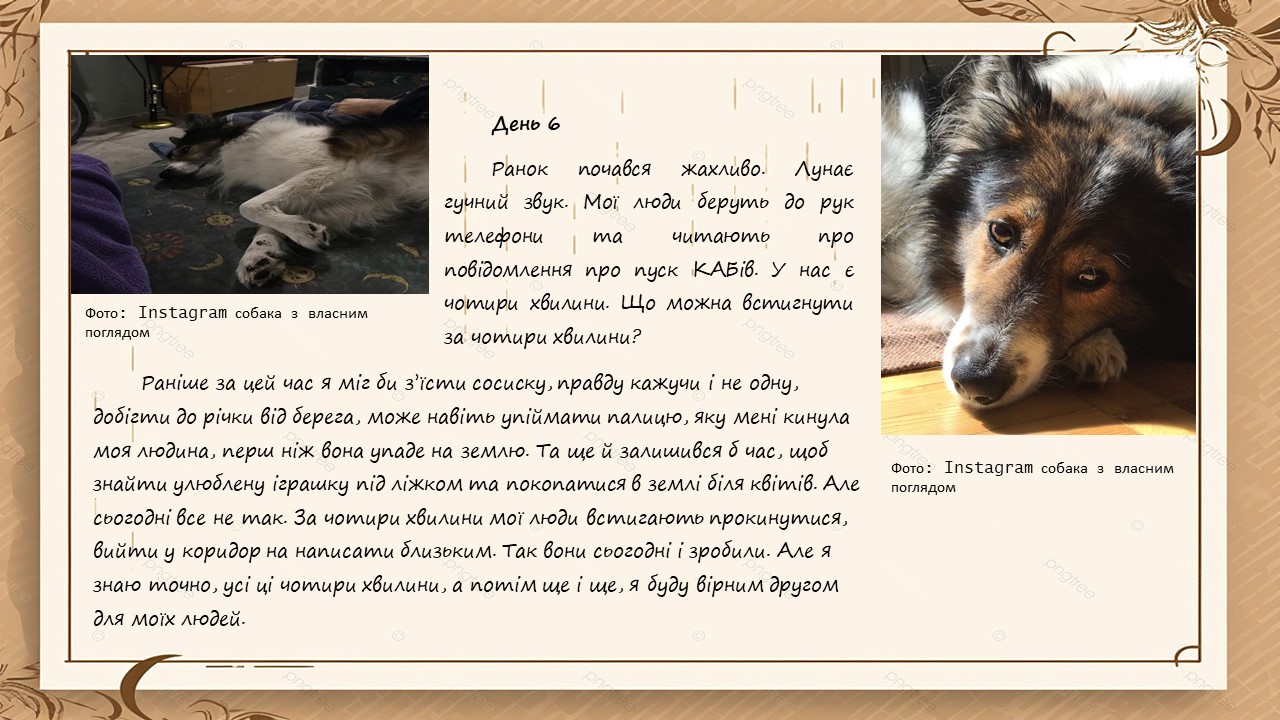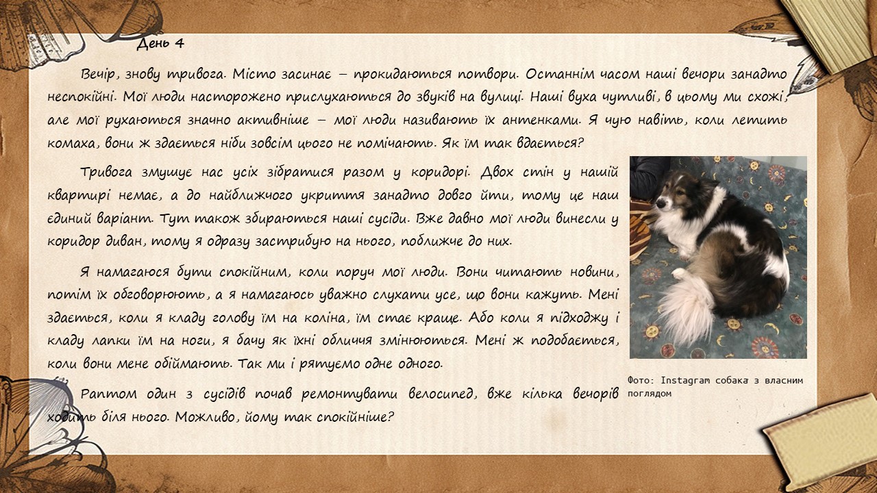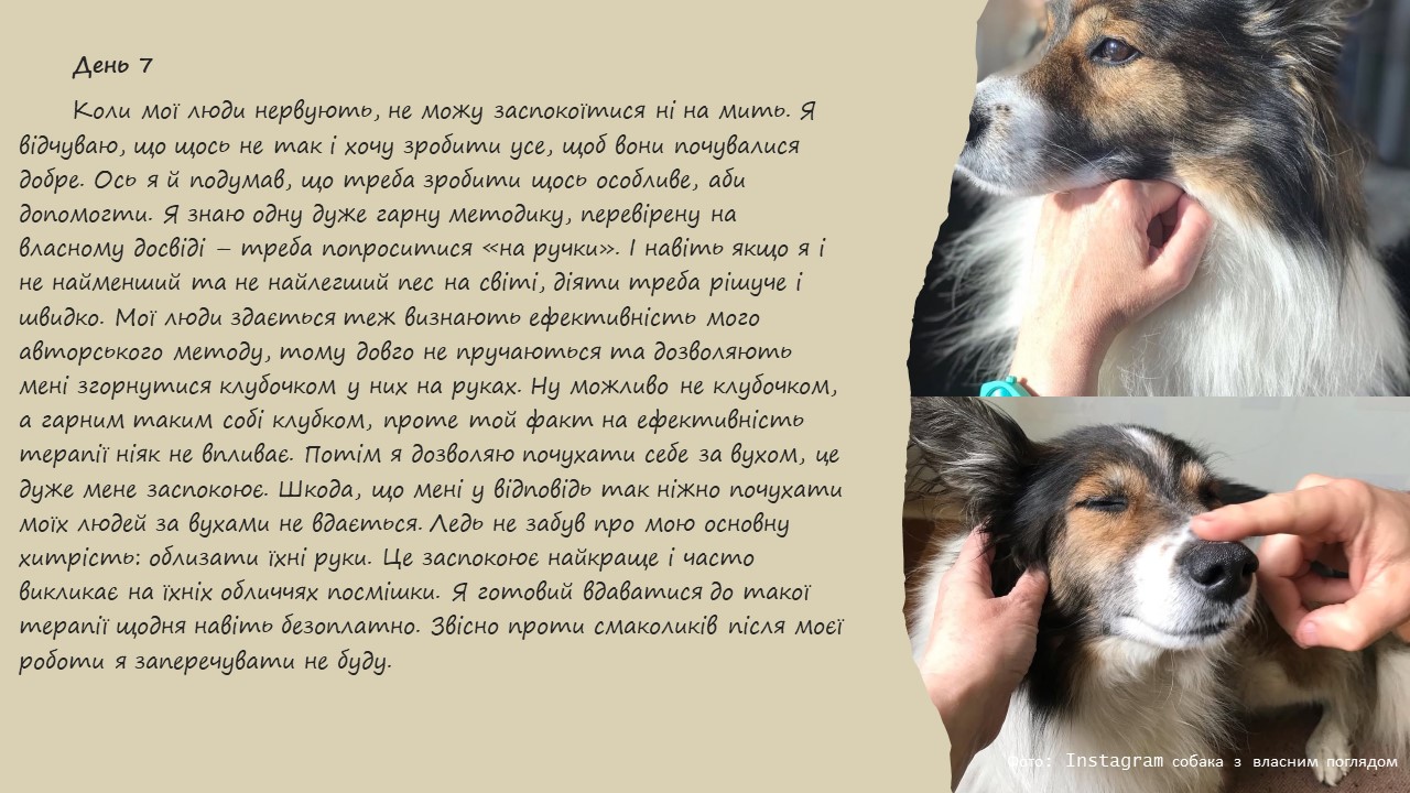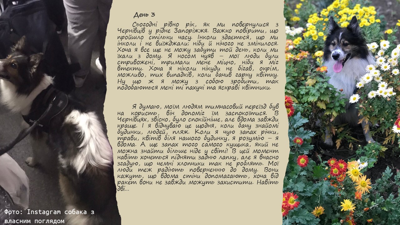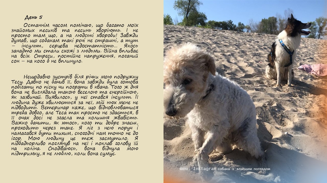Як відзначатиме собака у одному зі своїх записів: «Бути поруч – все, що я можу, але здається іноді це допомагає». Цей девіз став життєвим кредо тварини та його покликанням в умовах війни. І хоч пес Рубі – не людина, його здатність бути поруч в найскладніші моменти та відчувати настрій своїх господарів, не залишає жодних сумнівів у тому, що він більше ніж просто тварина.