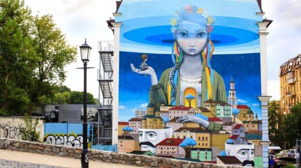 Алексей Кислов и Жюльен Маллан изобразили на панно девушку в украинском венке и телогрейке поверх вышиванки. Красавицу на рисунке задумывали как символическое отображение духа Украины. Стрит-арт высотой 15 метров создали на торцевой стене пятиэтажного жилого дома. Считается, что именно с этого панно в Киеве начался бум моды на муралы.