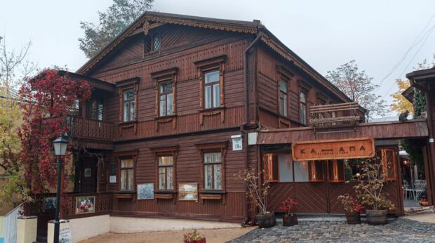 Деревянный фасадный двухэтажный дом расположен на Андреевском спуске, 19А. Это уникальный пример деревянной застройки Киева конца 19 века. Оконные рамы, карнизы, фронтон и крыльцо дома украшены резными элементами.