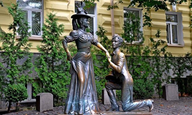 Фигуры персонажей пьесы Николая Старицкого “За двумя зайцями” и одноименного фильма установили возле Андреевской церкви в 1999 году. Тут происходило несостоявшееся венчание героев в исполнении актеров Кринициной и Борисова. Памятник быстро стал популярной киевской достопримечательностью. Рассказывают, что сюда в конце жизни любила приходить Маргарита Криницына. Она общалась с прохожими, раздавала автографы, фотографировалась с желающими.