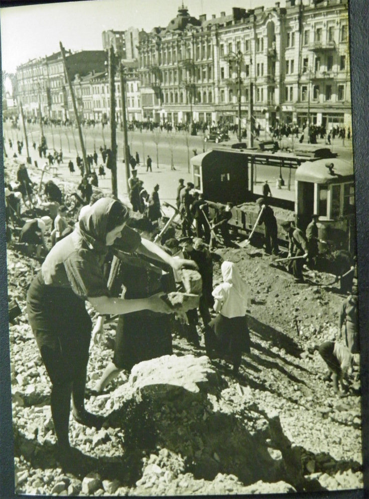 Они работали в две смены, чтобы как можно скорее вернуть Крещатику былой вид «улицы радости и счастья», как писали тогда газеты. 4 июля 1944 года к расчистке центральной улицы Киева присоединились известные украинские писатели Павел Тычина, Максим Рыльский, Владимир Сосюра, Юрий Яновский и другие.